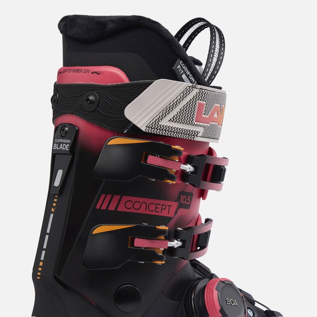 Pohodlí se setkává s výkonem pro odhodlané lyžařky. Dámské lyžařské boty Lange Concept 10.5 BOA® nastavují nový standard pohodlí a snadného použití v kategorii all-mountain. Spojují širší tvar skeletu 103 mm Comfort Last, konstrukci Easy Entry and Exit a jazyk Comfort Profile Tongue, díky čemuž se snadno obouvají, perfektně padnou a skvěle fungují na svahu. Technologie Suspension Blade propojuje horní a spodní část komínu pro plynulý přenos síly a jistotu v každém oblouku. Díky dámskému specifickému komínu, přizpůsobitelné vnitřní botičce a mikro-nastavitelnému systému BOA® Fit System model Concept 10.5 vyvažuje přesné padnutí a výkon tak, abys mohla zůstat plně soustředěná na zábavu. Silná flexe 105 je určena pro pokročilé lyžařky hledající výkon a preciznost. Jednoduchý nastavitelný insert na komínu umožňuje změkčit flexi o 8 %.Technologie Dual Core kombinuje tvrdé a měkké plasty pro cílený přenos síly a optimální průhyb skeletu, což zvyšuje odezvu, kontrolu a přesnost padnutí. Snadné obouvání a vyzouvání díky jazyku Comfort Profile Tongue bez použití rukou. Tvarovatelná botička Thermoformable Comfort Fit je z 80 % přizpůsobitelná a obsahuje dvouvrstvé recyklované PU polstrování v oblasti paty, kotníku a přední části chodidla, které se přizpůsobí tvému chodidlu a poskytne pocit přirozeného propojení s botou po celý den.Technologie Suspension Blade propojuje horní a spodní část komínu pro plynulé tlumení nárazů a vyšší kontrolu, čímž zvyšuje jistotu při lyžování. Systém Flex Adjust obsahuje jednoduchý insert na komínu, který umožňuje jemně doladit flexi výměnou elastomeru.Systém BOA® Fit System s technologií H+i1 je navržen speciálně pro nároky alpského lyžování a nabízí mikro-nastavitelné, víceosé a přesné padnutí, které rovnoměrně obepíná chodidlo, snižuje tlakové body, zlepšuje držení paty a zajišťuje precizní kontrolu od hrany k hraně. Předinstalované podrážky GripWalk® s gumovým vzorkem a zakulacenou špičkou poskytují přirozenější krok a lepší trakci, přičemž zůstávají plně kompatibilní s alpským vázáním.Parametry