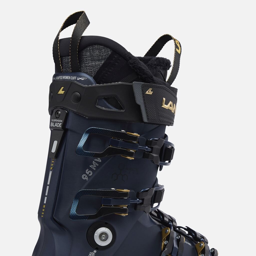 Větší výkon a více kontroly s menší energií. Dámské lyžařské boty Lange Shadow 95 MV přinášejí do all-mountain lyžování novou úroveň přenosu síly, pohlcování vibrací a pohodlí. Naše technologická inovace zesiluje váš přenos energie do boty prostřednictvím mechanické výhody technologie Dual Pivot and Suspension Blade. Nová konstrukce zvyšuje přenos síly až o 26 %, což vám dává větší výkon a kontrolu s menší energií, námahou. Čistý, konzistentní flex boty je kombinován se zvýšenou absorpcí nárazů skrz skelet pro lepší pocit a kontakt se sněhem. Stejně jako u celoodpruženého kola vám tato kombinace umožňuje lyžovat déle a efektivněji. Spolu s flexí 95 poskytuje tato bota středně pokročilým a pokročilým lyžařkám silnou platformu pro zvyšování a posouvání lyžařské techniky. Nižší skelet o šíři 100 mm, asymetrický jazyk a tepelně tvarovatelná vnitřní botička Auxetic je speciálně navržena pro ženy se standartním chodidlem. Suspension Blade-lišta spojuje horní skelet se spodním pro přesný přenos síly do lyží. Naše stélky sport Fit jsou navrženy tak, aby poskytly maximální pohodlí a dlouhou životnost. Podrážky GripWalk® mají pryžové provedení a špičku rockerového tvaru pro přirozenější pohyb při chůzi a zvýšenou trakci.Parametry