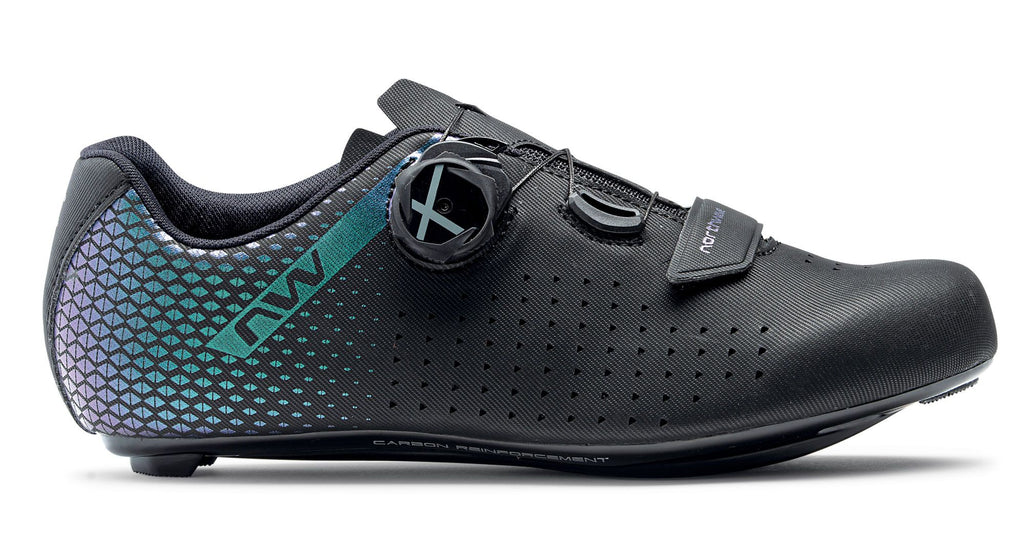 Dámské silniční tretry Northwave redukující nežádoucí tlaky a zaručující skvělou prodyšnost. Podrážka NRG Air Carbon s 5 větracími otvory ve středně tvrdém provedení (index tuhosti 8/15) je kompatibilní s SPD pedály. Vrchní bezešvá konstrukce, je utahována pomocí rychloutahovacího systému Northwave SLW3 s možností velmi jemného utažení/povolení a je doplněna o spodní power strap na suchý zip. Utahování pomocí nejpevnějších lanek.