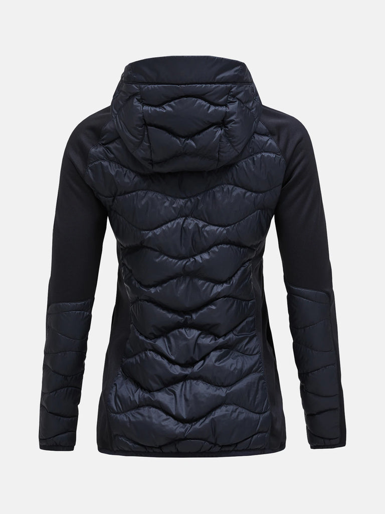 Dámská, kombinovaná bunda s kapucí z velmi lehkého materiálu. Přiléhavý střih, logo značky vyšité na hrudi, kvalitní prošívaná výplň z kachního peří se zárukou kontrolovaného ekologického původu v poměru 90/10, elastické rukávy a boční panely z úpletu pro maximální prodyšnost a pohodlí při každém pohybu. Nastavitelná kapuce, elastický lem na rukávech a v pase, boční otevřené kapsy, náprsní kapsa na zip, poutko na zádech. Minimální skladnost na cestách díky snadnému sbalení. Vyrobeno z částečně recyklovaného polyamidu bez obsahu PFC. Velmi praktický a nápaditý kousek pro všechny vaše outdoorové zážitky.